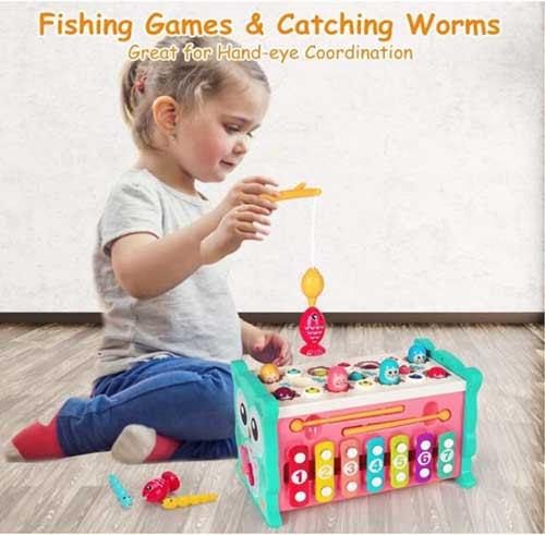 - Our pounding toys include- fishing, xylophone playing, gear turning, digital clock, number and shape recognition. There are also emoji sliding and dragging functions.