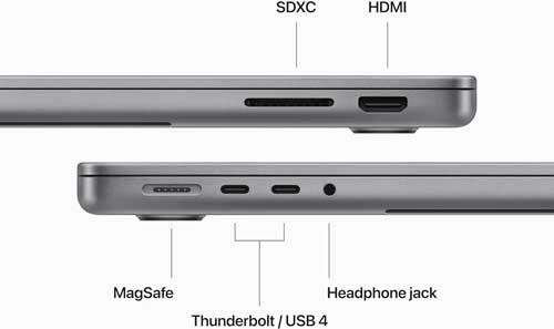 - This MacBook Pro features a MagSafe charging port, two Thunderbolt / USB 4 ports, an SDXC card slot, an HDMI port, and a headphone jack. Enjoy fast wireless connectivity with Wi-Fi 6E and Bluetooth 5.3. Supports one external display. (Wi‑Fi 6E available in countries and regions where supported.)