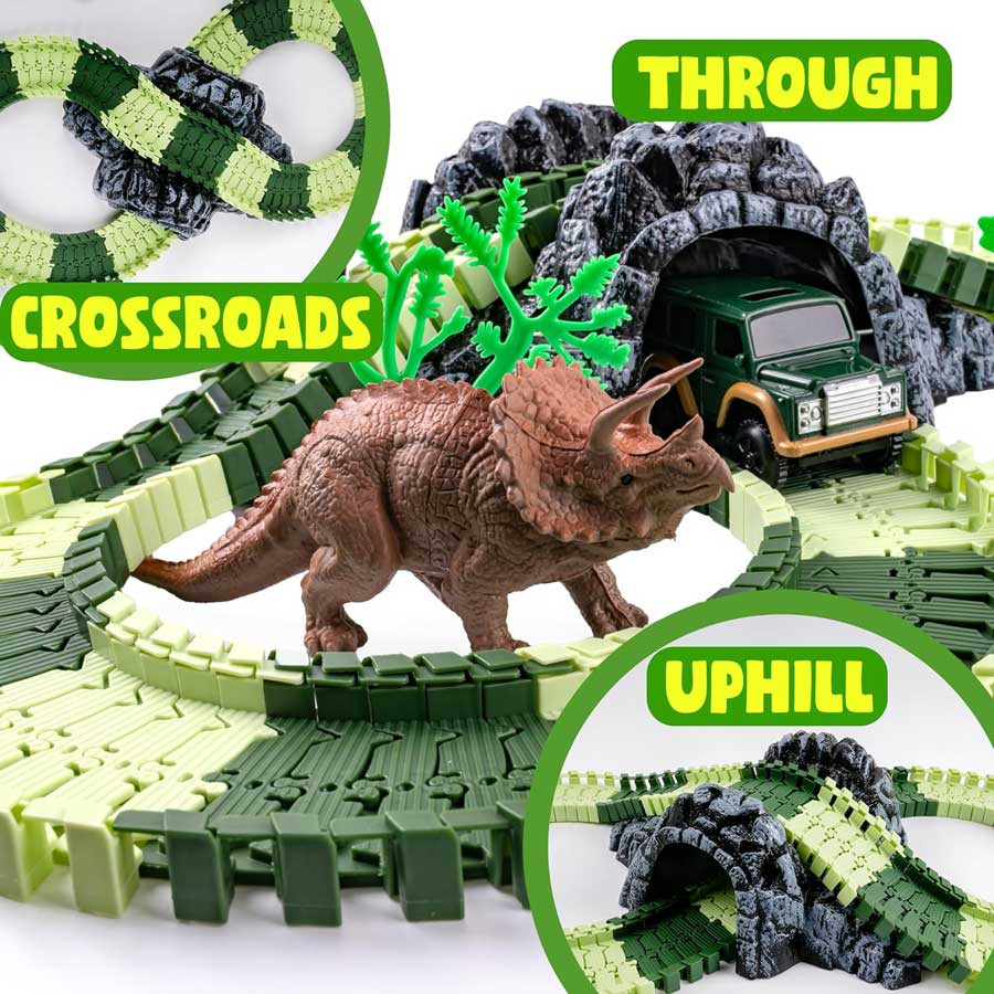 - With 117 pieces, it features different tracks, 2 dinosaur figures, 1 race car and more. Track pieces are easy to assemble and disassemble, making it convenient for storage or track design changes.