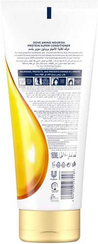 - ডোভ অ্যামিনো নুরিশ সুপার কন্ডিশনার চুলের কোঁকড়ানো ভাব কমায় এবং ক্ষতিগ্রস্ত ও শুষ্ক চুলকে ১০০% পর্যন্ত গভীরভাবে পুষ্ট করে।
