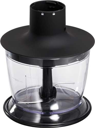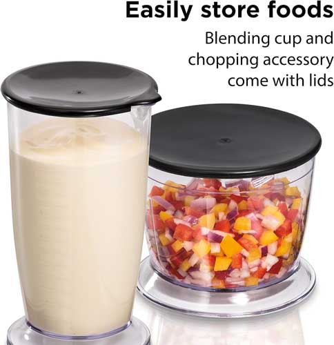 - This 7-piece deluxe set includes a stainless steel blending wand, whisk, chopping bowl and mixing cloth with lid.