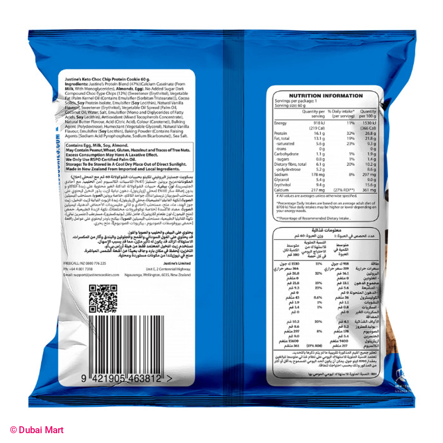 - Freshly baked, keto friendly and delivering a guilt free, yet smart snacking solution. A healthier version of your traditional choc chip cookie with soft notes of vanilla and chocolate chunks that melt in your mouth. This delicious soft baked cookie is extremely low in carbs, just 1.1 g per serve and is high in protein, delivering 16.1 g of protein per 60 g cookie. That's 32%DI of your protein needs. It is made with no wheat and gluten, just pure almond meal as its base for added nutrition. It is high in fibre too, delivering 20% DI of your fibre needs.