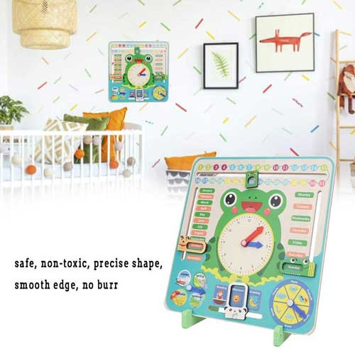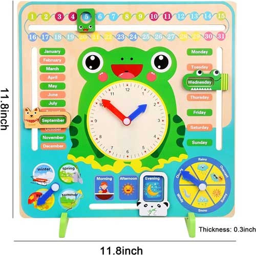 - কাঠের ঘড়ির বোর্ডে একটি তারিখ, সপ্তাহ, মাস, আবহাওয়া, সময়, ঋতু, শিশুদের জন্য খেলনা ক্যালেন্ডার রয়েছে যা শিশুদের খেলাধুলা করতে শেখায়। এছাড়া শিশুরা এই গুলো সমন্ধে ধারনা লাভ করতে পারে।