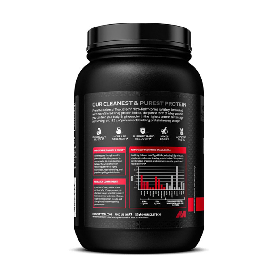 - From the makers of MuscleTech Nitro-Tech comes IsoWhey, formulated with microfiltered and ultrafiltered whey protein isolate, the purest form of whey protein you can feed your body. Engineered with our highest protein percentage per serving, with 25 g of pure musclebuilding protein in every scoop
