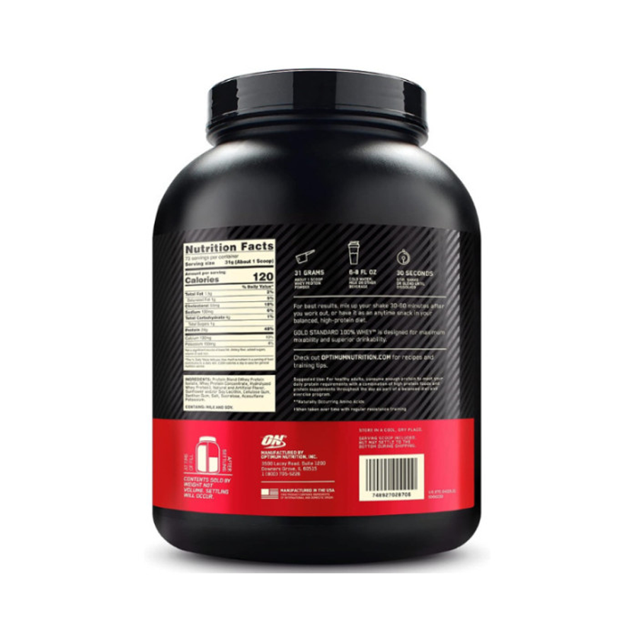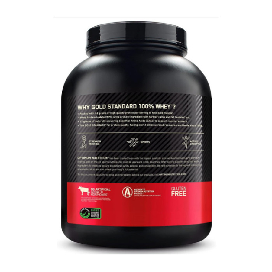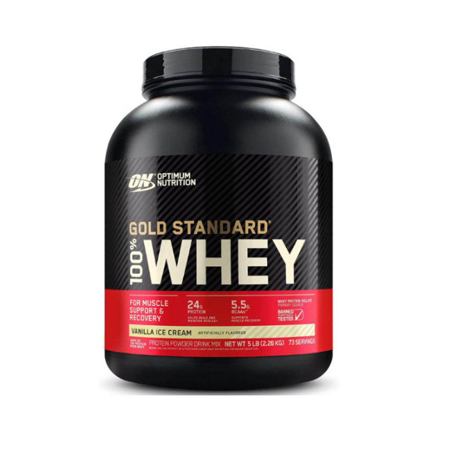 - Optimum Nutrition's Gold Standard 100% Whey uses pure Whey Protein Isolates as the primary ingredient. Combined with ultra-filtered whey protein concentrate, each serving provides 24 grams of all-whey protein and 5.5 grams of naturally occurring Branched Chain Amino Acids (BCAAs) which are prized by athletes for their muscle building qualities. With more than 20 tempting flavors to choose from, On Gold Standard 100% Whey gives you plenty of ways to keep workout recovery interesting. Search "On Apparel True Strength" to see our new ON clothing line! Mix 1 scoop in 6-8 fluid ounces of cold water, milk, or beverage of choice. For best results, mix up your shake 30-60 minutes after your workout, or have it as an anytime snack in your balanced, high-protein diet.