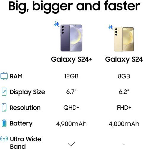 - There’s even more to love about Galaxy S24 and S24+. Need more? Galaxy S24+ features a larger QHD screen with the highest resolution on a Galaxy device.