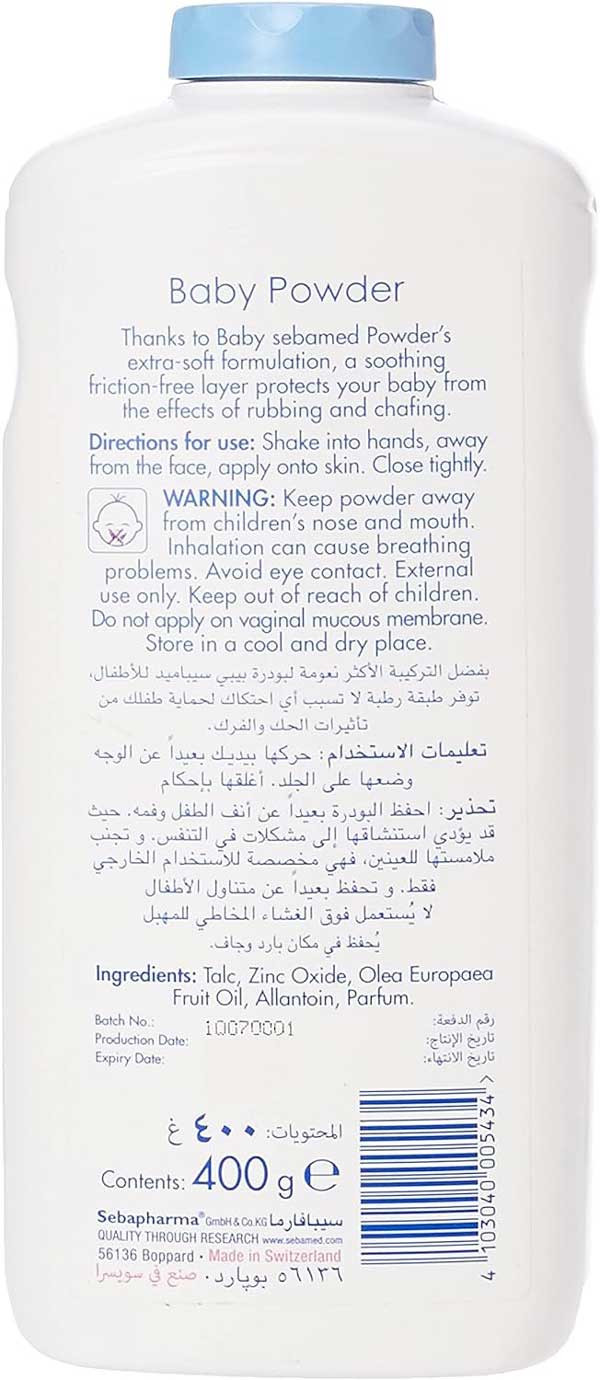 - Sebamed Baby Powder contains various ingredients such as formaldehyde, nitrosamines and dryoxane to strengthen the immune system of the baby's delicate skin.