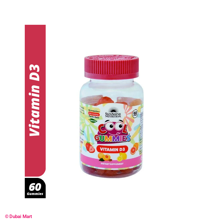 - Sunshine Nutrition€™s Cool Gummies €“ Vitamin D3 specially formulated with Strawberry, Orange and Lemon Flavors. A factor in the maintenance of good health helps in the development and maintenance of bones and teeth.