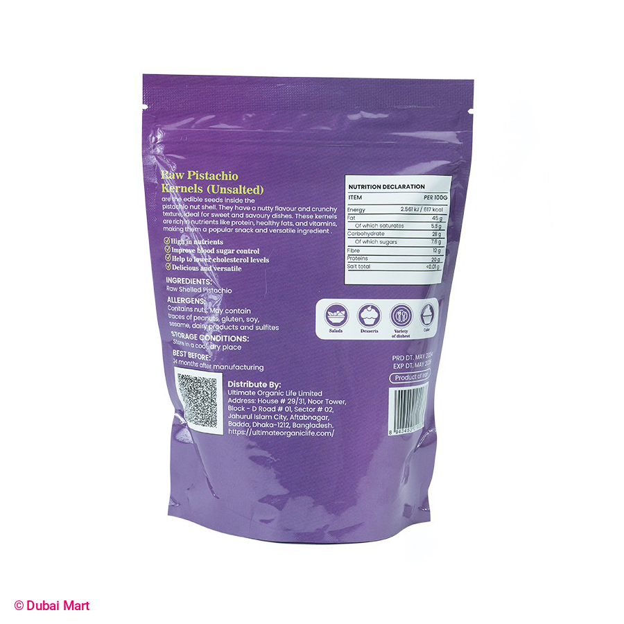 আল্টিমেট অর্গানিক লাইফের পেস্তা বাদাম সম্পূর্ণ প্রাকৃতিক উপায়ে চাষ করা এবং হালাল সার্টিফায়েড, যা কোনো প্রকার লবণ বা কেমিক্যাল সংমিশ্রণ ছাড়াই আপনার হাতে পৌঁছে দেয়া হয়। এটি স্বাস্থ্যকর ফ্যাট এবং এনার্জির একটি চমৎকার উৎস। আপনার সঠিক লাইফস্টাইলের জন্য পেস্তা বাদাম অত্যন্ত গুরুত্বপূর্ণ একটি উপাদান হিসেবে বিবেচিত হতে পারে, যা আপনার খাদ্য তালিকায় আজই যোগ করা উচিত।
