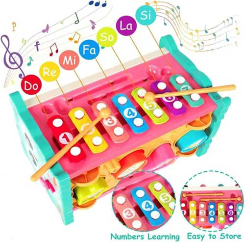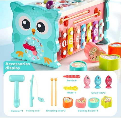 - Our pounding toys include- fishing, xylophone playing, gear turning, digital clock, number and shape recognition. There are also emoji sliding and dragging functions.