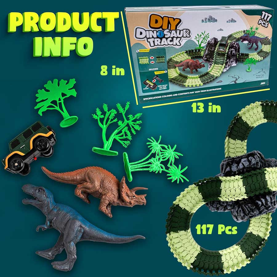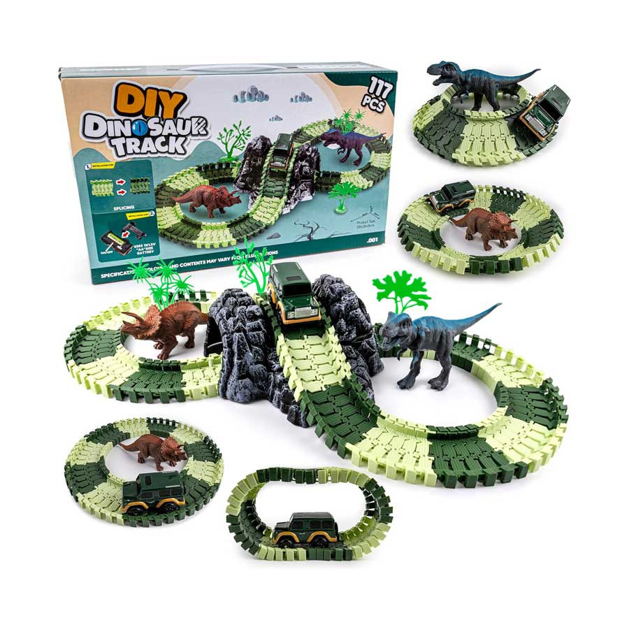 - With 117 pieces, it features different tracks, 2 dinosaur figures, 1 race car and more. Track pieces are easy to assemble and disassemble, making it convenient for storage or track design changes.