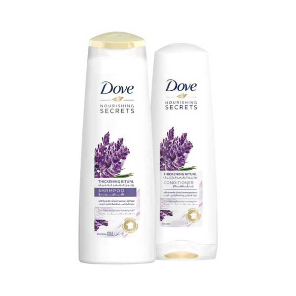 - Dove Shampoo + Conditioner with Lavender Oil and Rosemary Extract for fuller and thicker hair.
