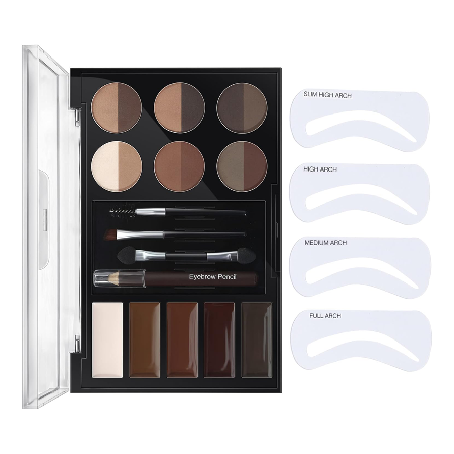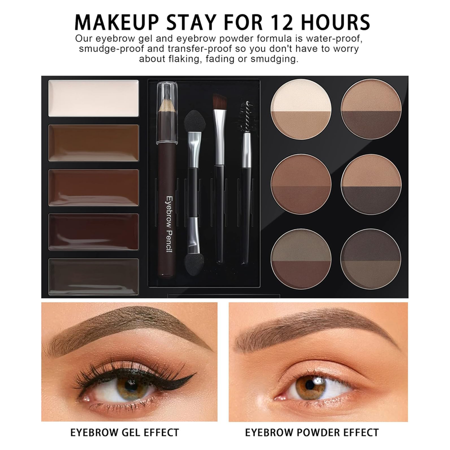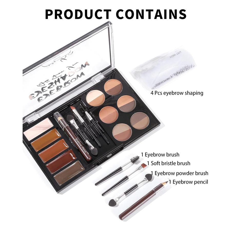 - 25 Piece Eyebrow Makeup Palette including: 12 waterproof brow powders, 5 sweatproof brow gel, 4 classic and timeless brow shapes, 3 Eyebrow Brush and 1 Eyebrow Pencil.