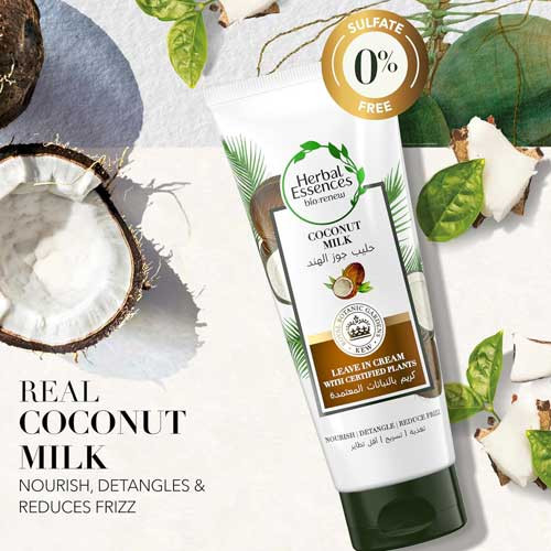 - Herbal Essences Coconut Milk Leave-in Conditioner moisturizes and smooths hair with coconut milk and antioxidants. Besides, it helps to eliminate frizziness of hair for up to 72 hours.