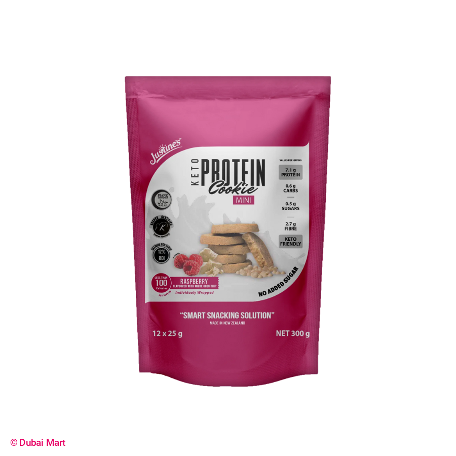 - For all you berry lovers, our delicious soft textured mini Raspberry White Choc Protein Cookie is bursting with fresh natural raspberry flavours & studded with chunks of no added sugar creamy white choc chips that melt in your mouth. This ketolicious cookie is ultra low carb & a no added sugar, better for your option of that sugar ladened traditional cookie. It will tantalise your taste buds & satisfy your sweet cravings for that pure guilt free indulgence! Available in 25g serving sizes, each moreish keto friendly cookie contains only 0.6g Carbs, 7.1g of protein, 12% RDI of your calcium needs along with 9% DI of your fibre needs. They are made with no wheat and gluten, just pure almond meal is used & as always, naturally sweetened with erythritol. To make things even better, each serve contains only 95 calories per serve. They are your perfect snacking solution if you are watching those calories too!