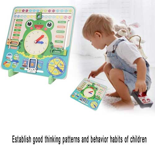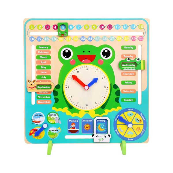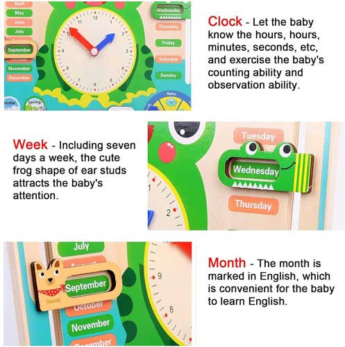 - কাঠের ঘড়ির বোর্ডে একটি তারিখ, সপ্তাহ, মাস, আবহাওয়া, সময়, ঋতু, শিশুদের জন্য খেলনা ক্যালেন্ডার রয়েছে যা শিশুদের খেলাধুলা করতে শেখায়। এছাড়া শিশুরা এই গুলো সমন্ধে ধারনা লাভ করতে পারে।