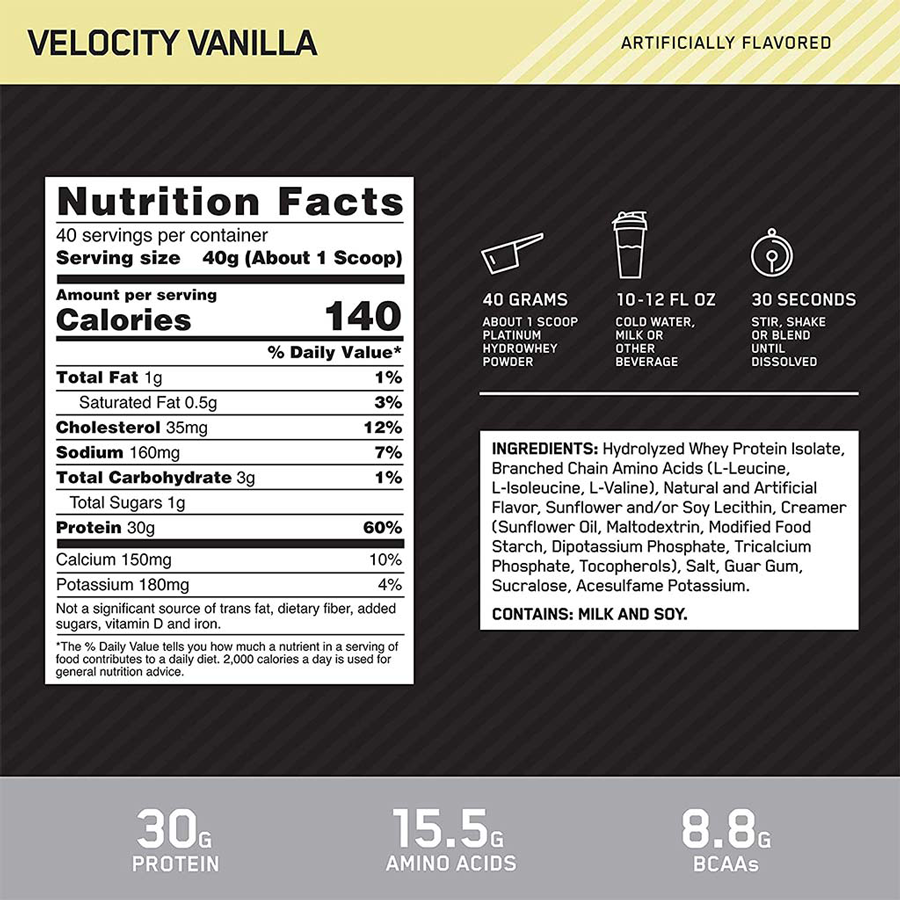 - Platinum HYDROWHEY is the most advanced whey protein ever developed containing 100% Hydrolyzed Whey Protein Isolate. Hydrolyzed Whey Protein Isolate has much of the carbohydrates, fat and lactose ""isolated"" out using sophisticated filtering technologies, and hydrolyzing breaks larger proteins down into smaller pieces, so ultra-pure whey isolate is able to get into your system rapidly for muscle recovery support. Finally, we dialed up this ultra-pure and rapidly digesting formula with added micronized Branched Chain Amino Acids (BCAAs).
