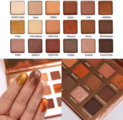 - An eyeshadow palette of 18 warm colors gives you a long-lasting and crease-free makeup look.