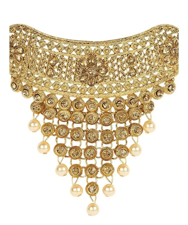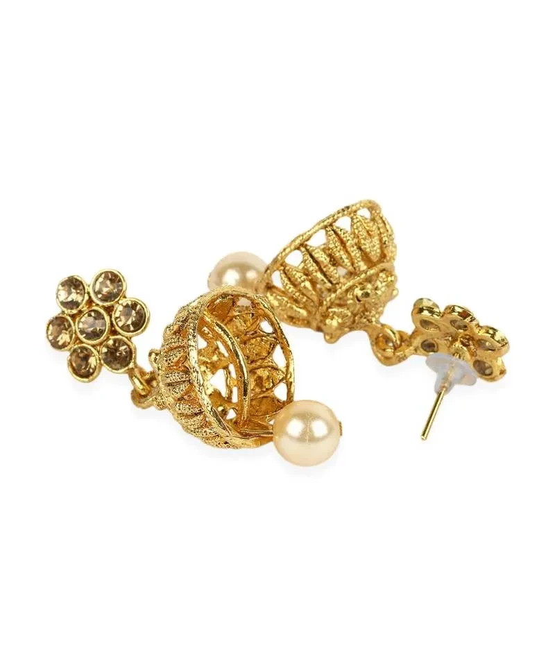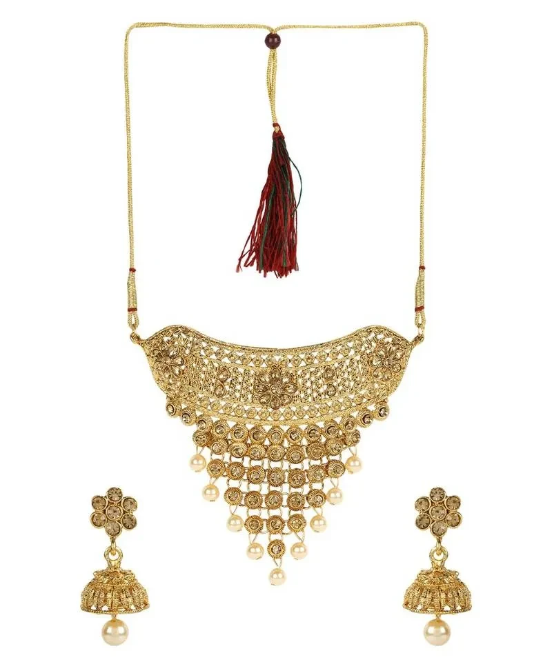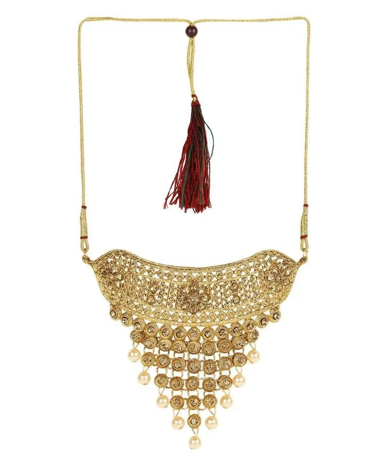 TRADITIONAL GOLD PLATED DESIGNER TASSELLED BRIDAL NECKLACE WITH JHUMKAS