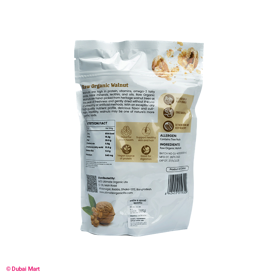 আল্টিমেট অর্গানিক লাইফ অর্গানিক ওয়ালনাট হলো একটি সম্পূর্ণ প্রাকৃতিক উপায়ে চাষ করা স্বাস্থ্যকর সুপারফুড, যা পুষ্টিগুণে ভরপুর। এটি প্রয়োজনীয় ওমেগা-৩ ফ্যাটি অ্যাসিড, অ্যান্টিঅক্সিডেন্ট, ভিটামিন এবং মিনারেল সমৃদ্ধ। ওয়ালনাট তার ক্রাঞ্চি টেক্সচার এবং প্রাকৃতিক স্বাদের জন্য বিখ্যাত, যা সহজেই বিভিন্ন খাবারের সাথে যুক্ত করা যায় এবং দৈনন্দিন পুষ্টি প্রয়োজন মেটাতে সহায়ক।