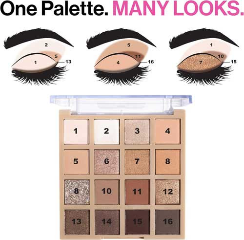- The nude eyeshadow palette in matte, shimmer and glitter finishes is highly pigmented so it lasts all day and blends smoothly on the eyes.