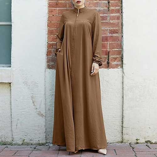 Women's Modest Zipper Stand Collar Loose Dress, Long Sleeve Casual Dress with Fashion Chiffon Hijabs Pack for Women